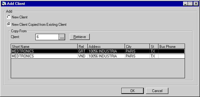 This screen is used to either add an entirely new client or create a new client using information defaulted from an existing client. After making a selection, click OK or press Enter to proceed.